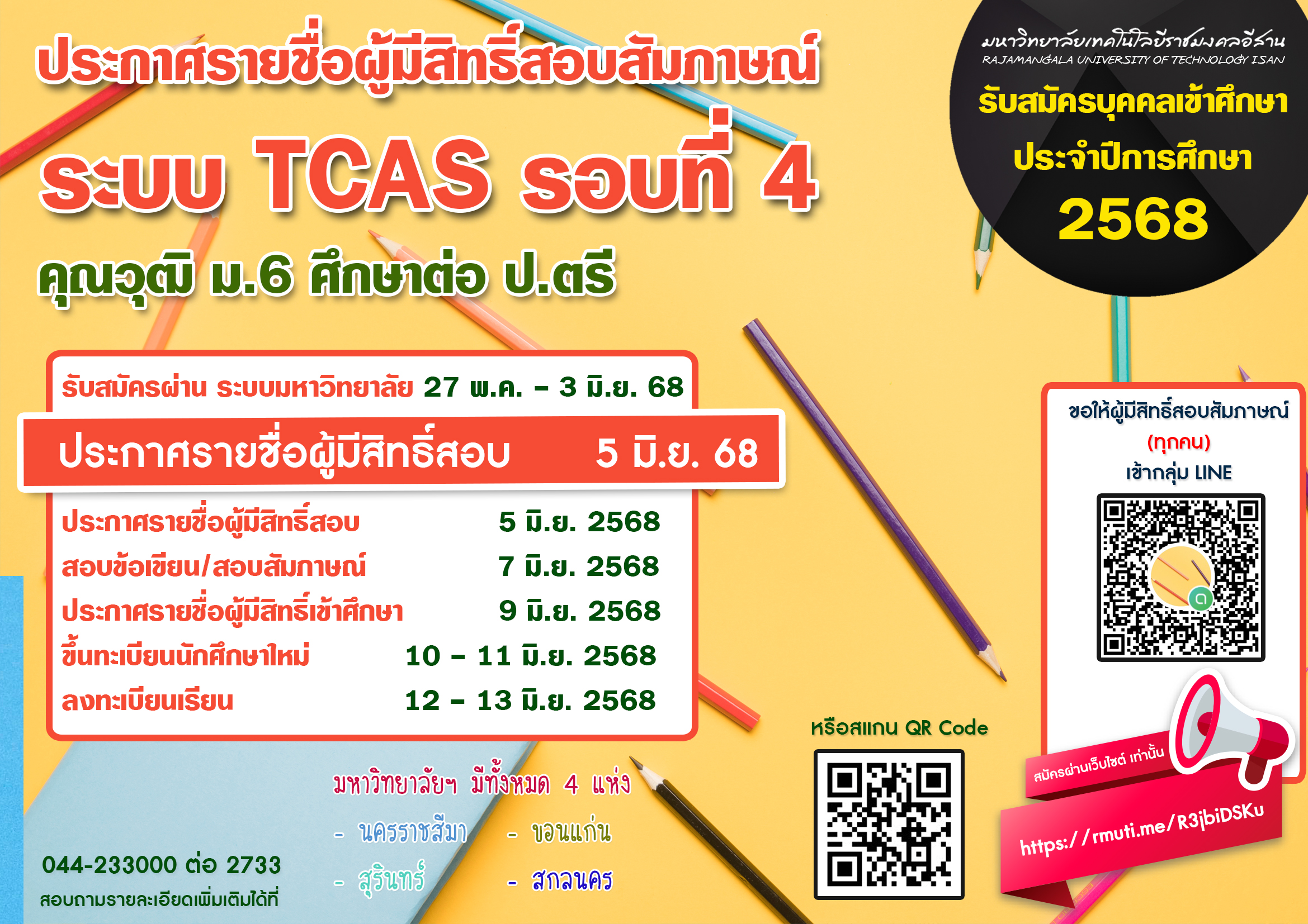 ประกาศรายชื่อผู้มีสิทธิ์สอบคัดเลือก ระบบ TCAS รอบที่ 4 ปีการศึกษา 2568 ประกาศ ดาวโหลดประกาศ โปรดคลิกที่นี่! คณะบริหารธุรกิจ ประกาศรายชื่อ โปรดคลิกที่นี่! คณะวิทยาศาสตร์และศิลปศาสตร์ ประกาศรายชื่อ โปรดคลิกที่นี่! คณะวิศวกรรมศาสตร์และเทคโนโลยี ประกาศรายชื่อ โปรดคลิกที่นี่! คณะสถาปัตยกรรมศาสตร์และศิลปกรรมสร้างสรรค์ ประกาศรายชื่อ โปรดคลิกที่นี่! คณะระบบรางและการขนส่ง ประกาศรายชื่อ โปรดคลิกที่นี่! คณะนวัตกรรมและเทคโนโลยีการเกษตร ประกาศรายชื่อ โปรดคลิกที่นี่!